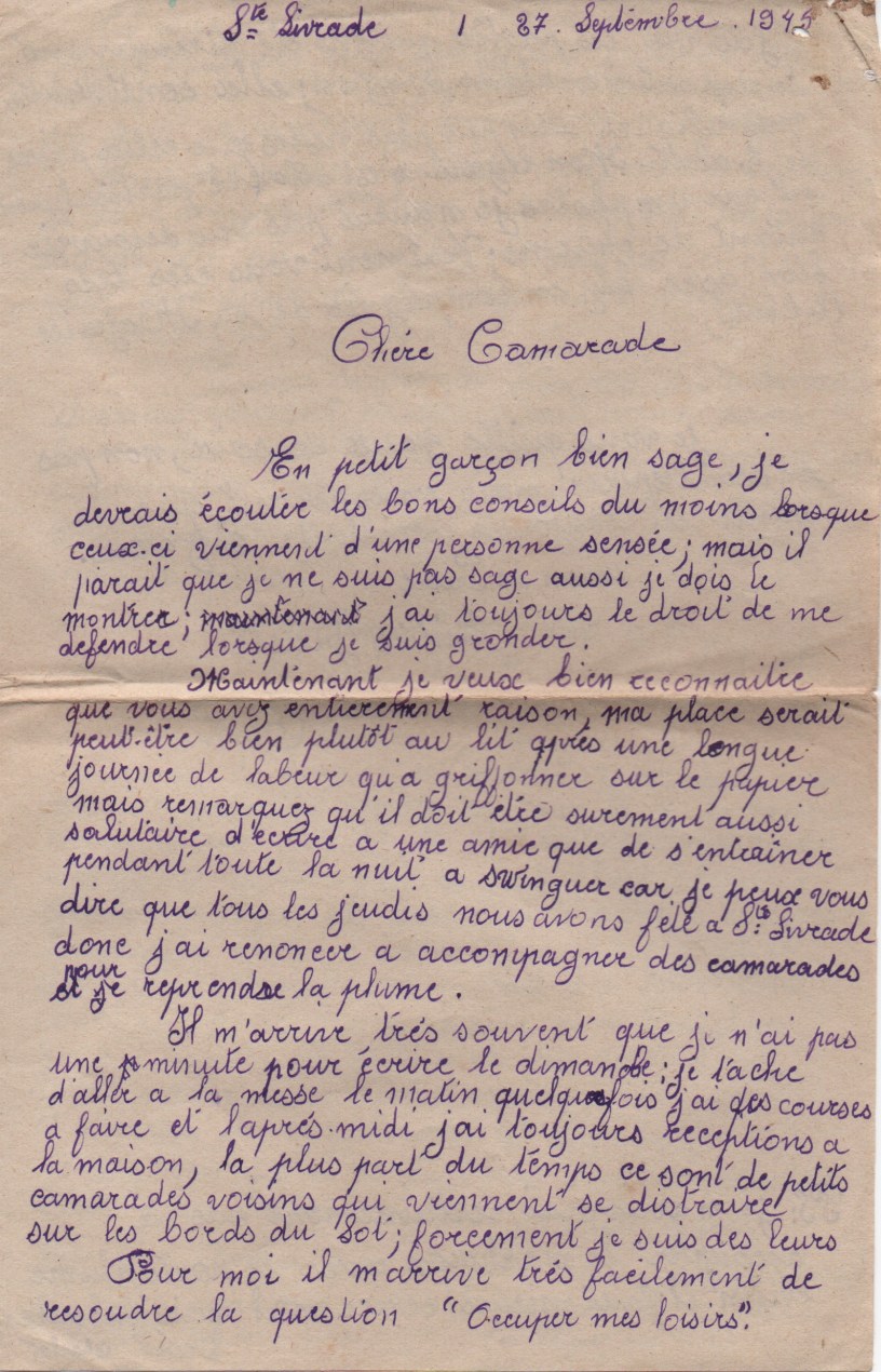 Maintenant je veux bien reconnaître que vous avez entièrement raison, ma place serait peut-être plutôt au lit après une longue journée de labeur qu’à griffonner sur le papier. Mais remarquez qu’il doit être sûrement aussi salutaire d’écrire à une amie que de s’entraîner pendant toute la nuit à swinguer car je peux vous dire que tous les jeudis nous avons fête à Ste Livrade, donc j’ai renoncé à accompagner des camarades pour reprendre la plume.