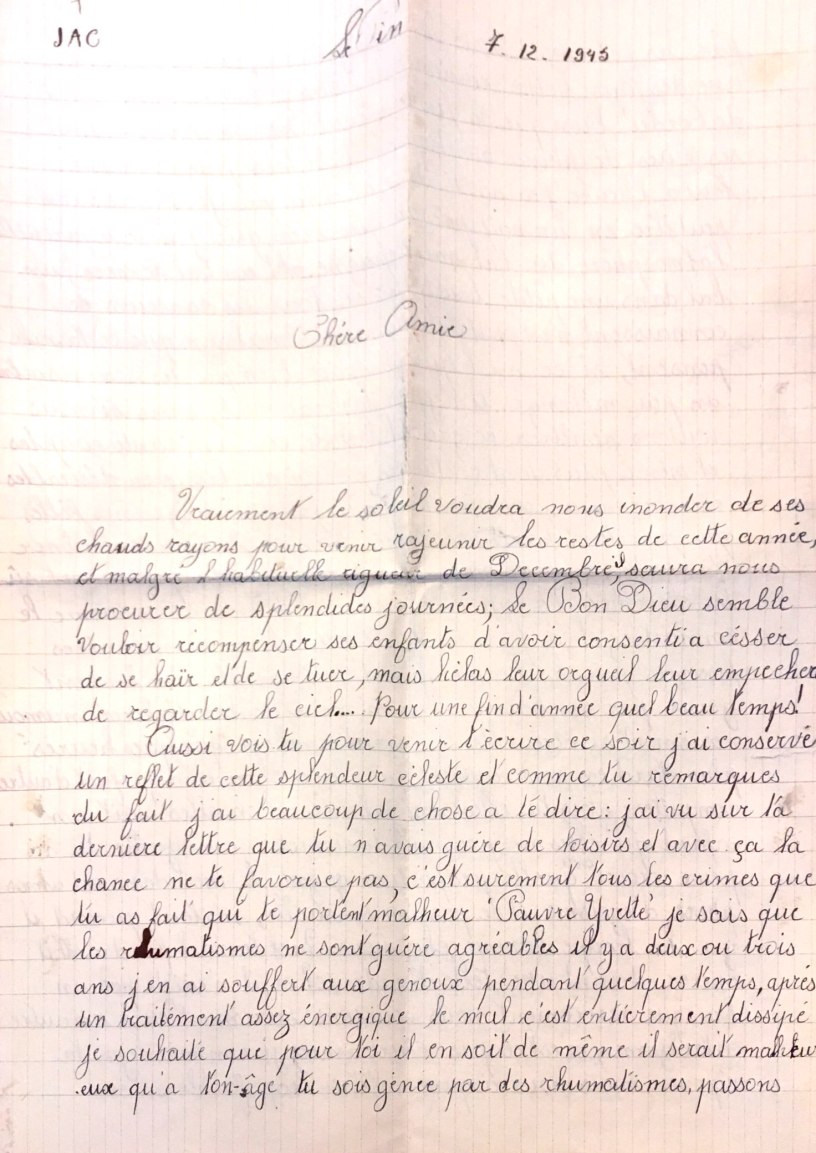 Pour une fin d’année quel beau temps! Aussi vois-tu pour venir t’écrire ce soir j’ai conservé un reflet de cette splendeur céleste et comme tu remarques du fait j’ai beaucoup de choses à te dire : j’ai vu sur ta dernière lettre que tu n’avais guère de loisirs et avec ça la chance ne te favorise pas. C’est sûrement tous les crimes que tu as faits qui te portent malheur « Pauvre Yvette » je sais que les rhumatismes ne sont guère agréables. Il y a deux ou trois ans j’en ai souffert au genou pendant quelques temps, après un traitement assez énergique le mal c’est entièrement dissipé. Je souhaite que pour toi il en soit de même, il serait malheureux qu’à ton âge tu sois gênée par des rhumatismes. Passons.