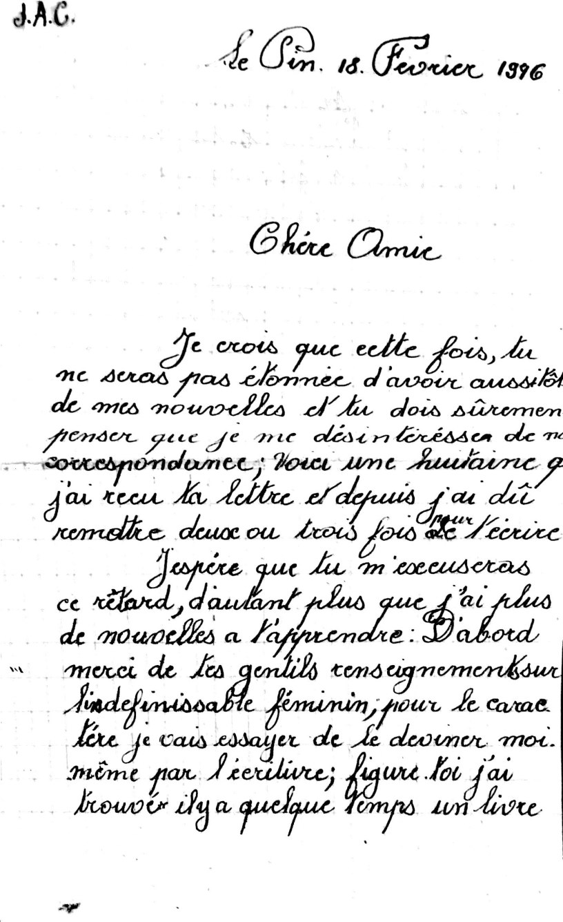 Je crois que cette fois tu ne seras pas étonnée d’avoir aussitôt de mes nouvelles et tu dois sûrement penser que je me désintéresse de notre correspondance; voici une huitaine que j’ai reçu ta lettre et depuis j’ai dû remettre deux ou trois fois pour t’écrire.
