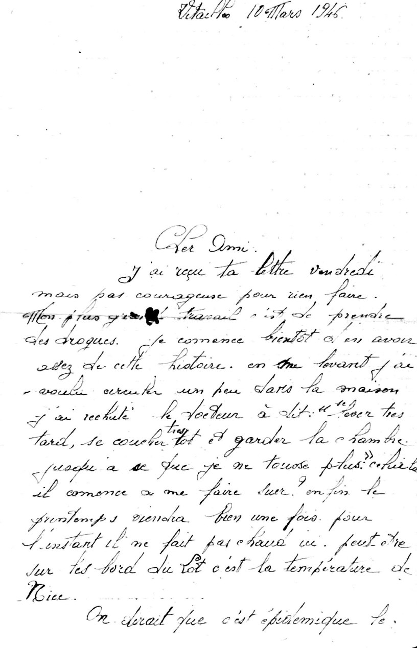 J’ai reçu ta lettre vendredi mais pas courageuse pour rien faire. Mon plus grand travail c’est de prendre des drogues. Je commence bientôt d’en avoir assez de cette histoire. En me levant, j’ai voulu circuler un peu dans la maison. J’ai rechuté. Le docteur a dit « lever très tard, coucher très tôt et garder la chambre jusqu’à ce que je ne tousse plus ». Celui là, il commence à me faire suer ! Enfin, le printemps viendra bien une fois. Pour l’instant il ne fait pas chaud ici. Peut-être sur les bords du Lot, c’est la température de Nice.
